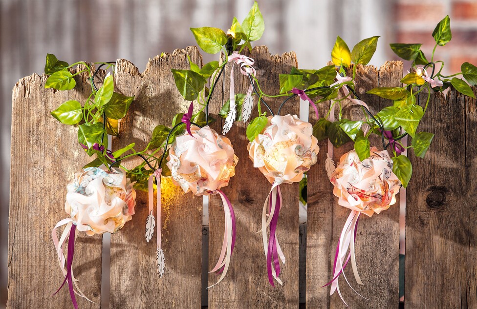 Decorate the bottom of the lamp balls with satin ribbons, insert a light chain, fix it with some wire. Other satin ribbons on the light chain are also very decorative. These can also be decorated with feather diffusers. Finally, wrap an ivy garland around the fairy lights, thereby concealing the cable of the fairy lights so that they will not be noticed in the decoration idea