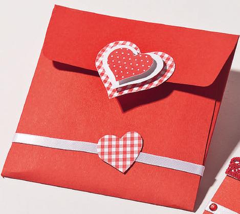 Transfer the smaller of the templates from the template set to red Craft cardboard sheet, Cut out the envelope and then glue it together. How to do this is described in detail in the instructions of the set.