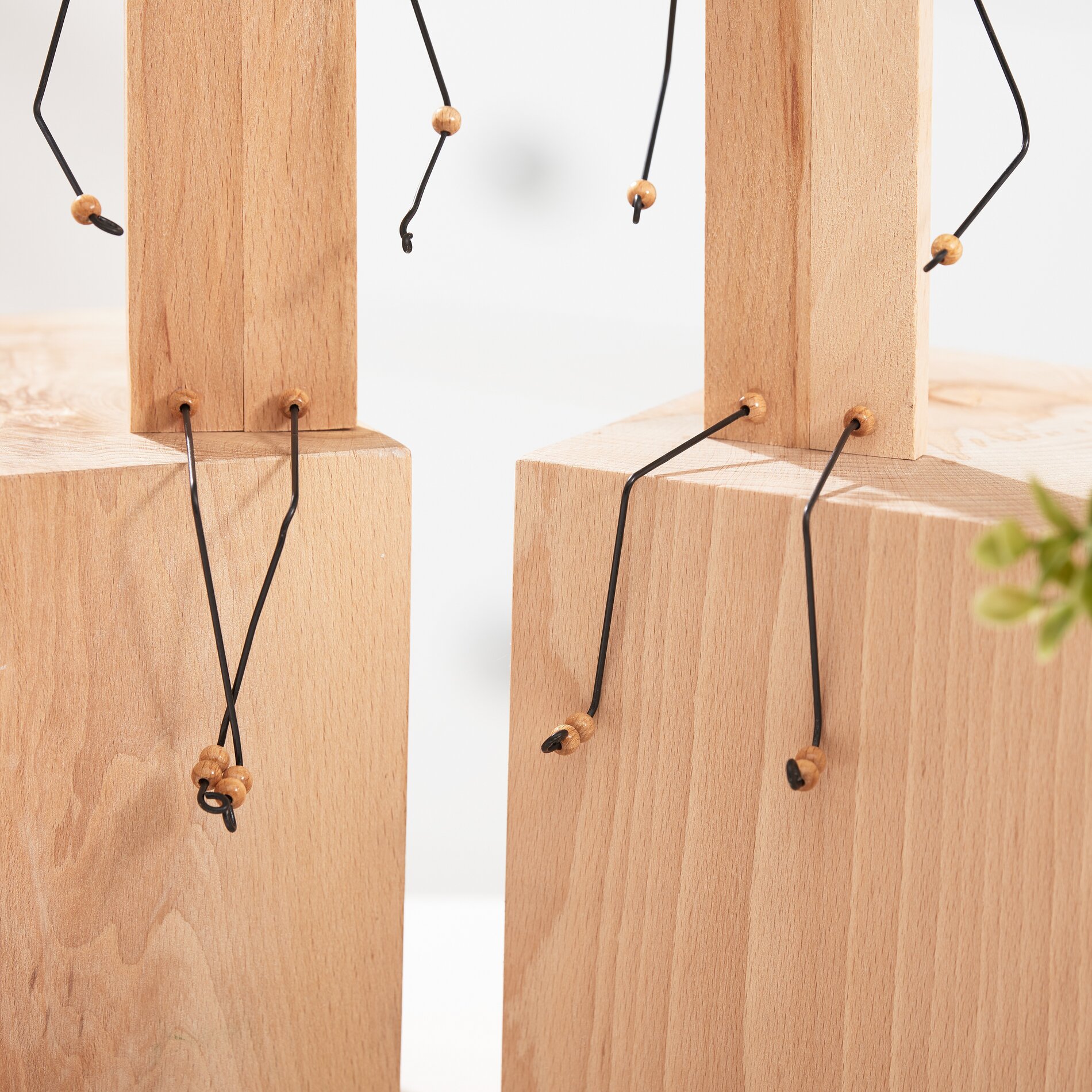 To attach the wire, you need to drill a few holes in the blocks. Drill two holes at the bottom for the legs and find a point at the top at 5.5 cm for the arms. Finally, drill two holes at the top for each ear. Be careful here so that the holes are all the same size and the wire fits through well.