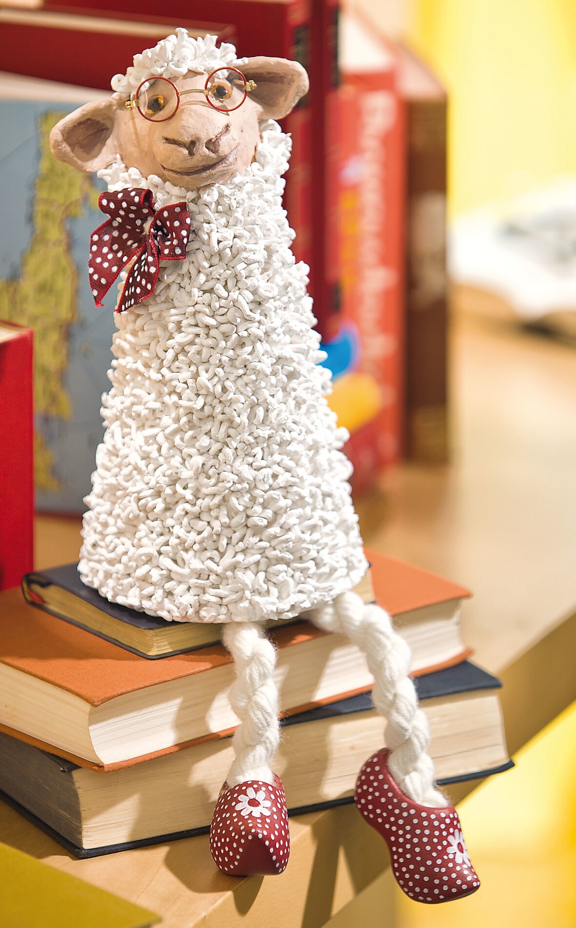 Emily, the funny swinging sheep, sits on the bookshelf and happily dangles her legs, the stable body is Modelling clay worked on with air-hardening, the Polystyrene cone head and the fur are then modelled and simply attached.