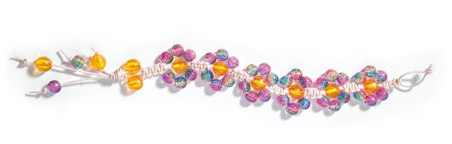 Knot 4 whole weaver knots, then thread 3 glitter beads on each of the outer cords and an orange acrylic bead on each of the two inner cords.