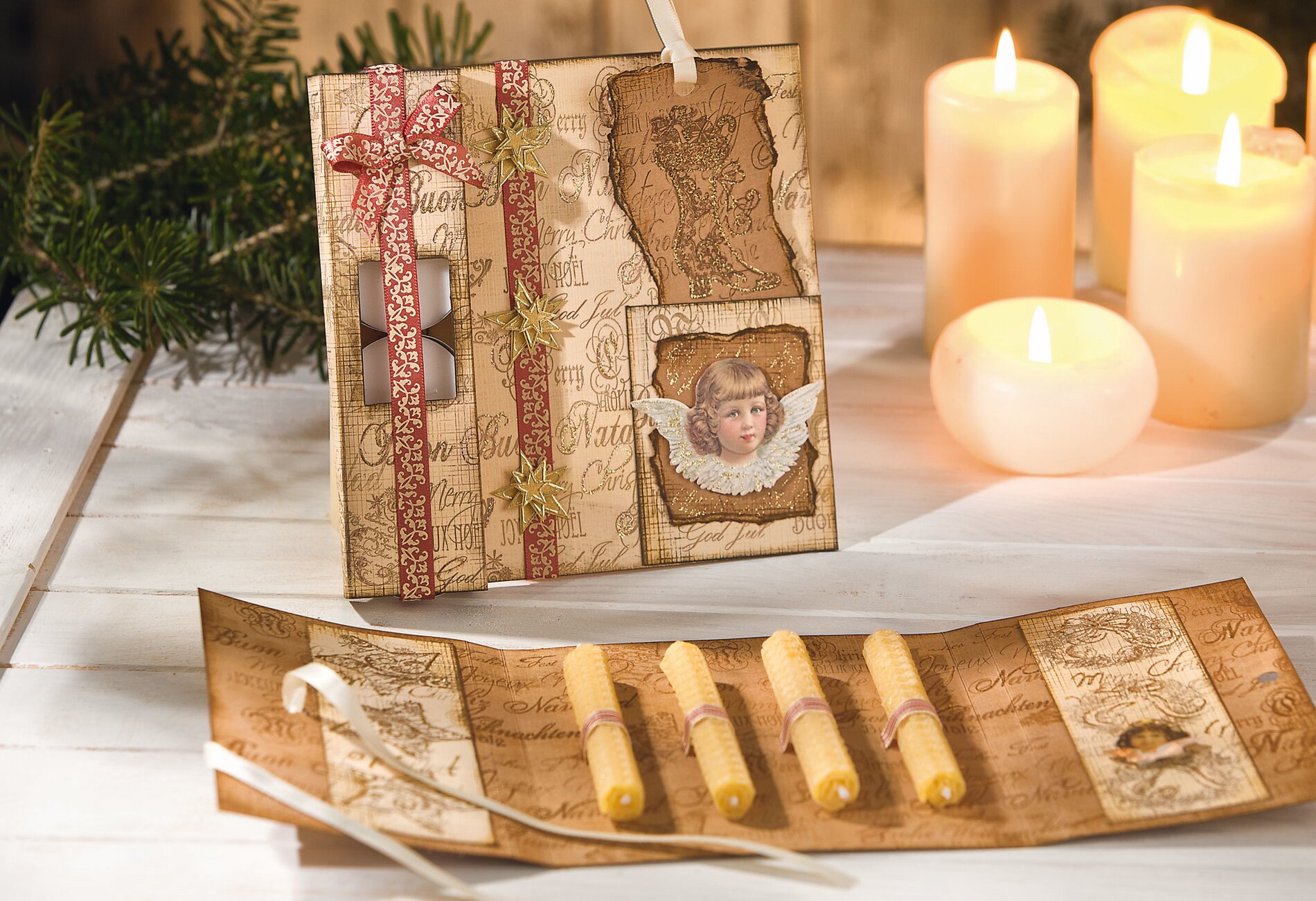 These elaborately designed cards have an inner life: They serve as a loving wrapping for four candles, which should guide the recipient through the Advent season
