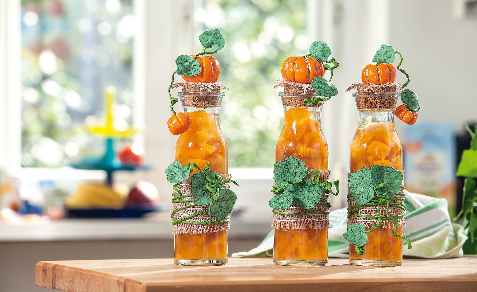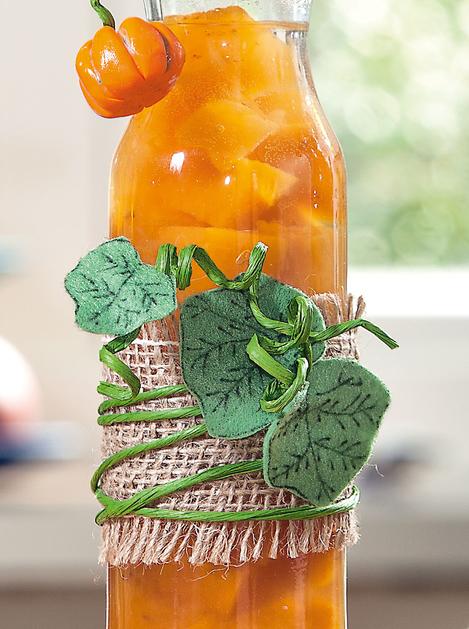 A great souvenir that every pumpkin fan will be happy about: As a present I fill the pickled pumpkins from the jars into the suitably decorated bottles. Since the corks are not airtight, they must be consumed within 1-2 weeks.