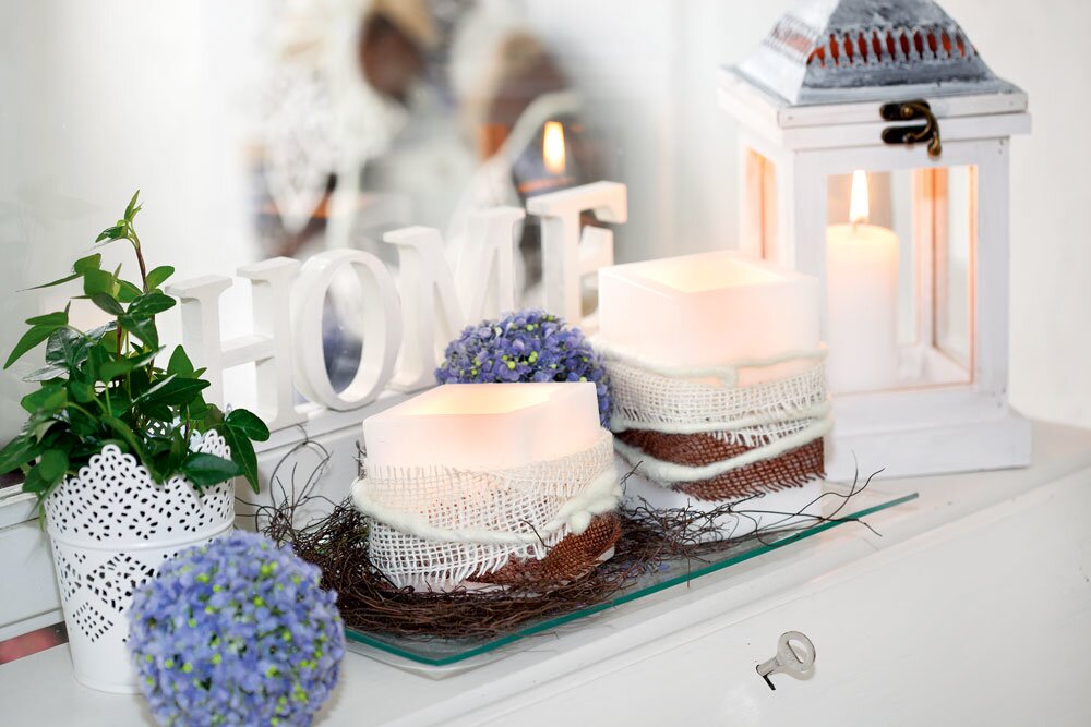 And it's as simple as that:Wrap brown and white Jute ribbon around the candles and fix the ends with hot glue. Wrap the felt cord over them and fix them as well. Spread decoration - Willow on the plate and decorate the candles on it. Remove the stem of the Allium flower and place it decoratively in the middle of the candles.