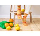 A voluminous, soft sock wool with color gradient, which results during knitting. The polyamide content makes the knits hard-wearing and the "superwash" fiber prevents felting in the washing machine at 40 °C on the gentle cycle. Not only cuddly socks for young and old can be knitted, but also warm sweaters, jackets, gloves, hats and scarves. For a sweater in size 38 you need about 500 g of the wool.