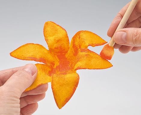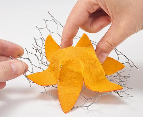 For the daffodils you make a Stencil from solid cardboard with the help of the template and cut the flowers from modelling felt. For the typical chalice shape you bend small hats out of wire mesh, over which you lay the flowers soaked in water to dry. After drying, wipe the edges with orange Handicraft paint .