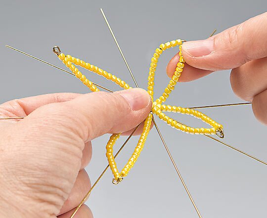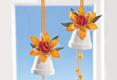 Now thread white rocailles on the long strands of Pearl Stars and short yellow rocailles. Two strands are connected with an eyelet each and then bent into shape. Glue the finished Pearl Stars into the felt flower. Now turn a piece of Acetate ribbon to the rose and fix it with wire. Then glue this rose into the pearl flower. Now cut leaves from Textile felt and glue them with the finished flowers on the pots.
