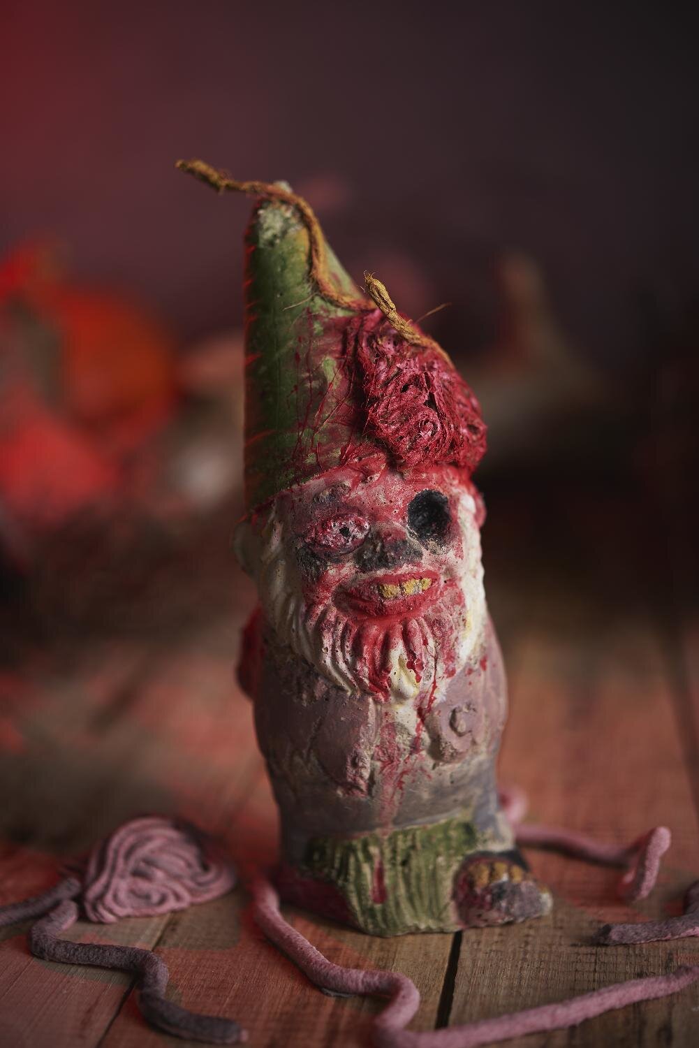 The dwarf can then be made into a zombie with colors . With Jute ribbon and glue is used to form and paint a brain and a cluster of worms