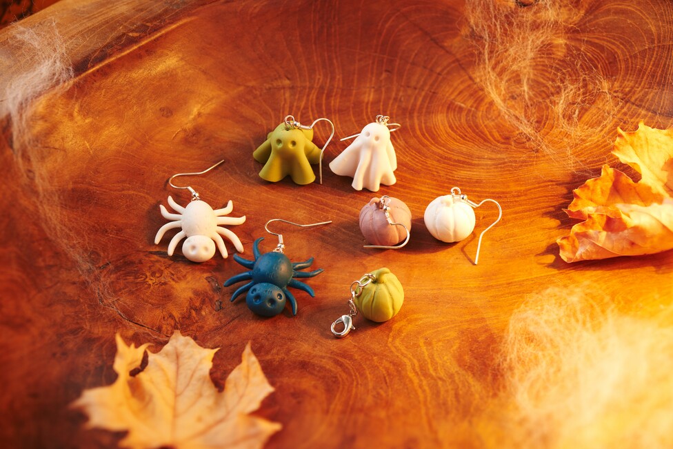 Before you put your figures in the oven, use the modeling tool to poke a small hole in the figure so that you can attach a decorative hook once it has hardened. You can also poke eyes into your figures. Harden your models in a preheated oven at around 110 degrees Celsius for about 30 minutes. Once they have cooled down, you can attach the decorative hooks using handicraft glue and enjoy your handmade Halloween jewelry.