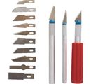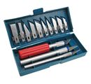 The practical hobby knife set consists of 13 blades and three hand pieces for precise craft work. The set is stored in a sturdy plastic box. The length of the different blades ranges between app. 3.0 - 4.4 cm and the handpieces are between app. 10.0 - 10.5 cm long with a Ø of app. 1.9 cm, 1.0 cm and 0.7 cm.