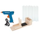 In addition to the glue gun, you will receive a matching holder made of robust birch plywood measuring approx. 30 x 10.5 x 12 cm and a total of 1 kilogram of glue sticks with a diameter of 11 mm and a length of approx. 20 cm. In addition to a suitable stand for the hot glue gun, the holder has a storage compartment measuring approx. 10.5 x 5 cm. The inside dimensions are approx. 9 x 3.5 cm and can be used to store the glue sticks. Thus all utensils for gluing are directly at hand