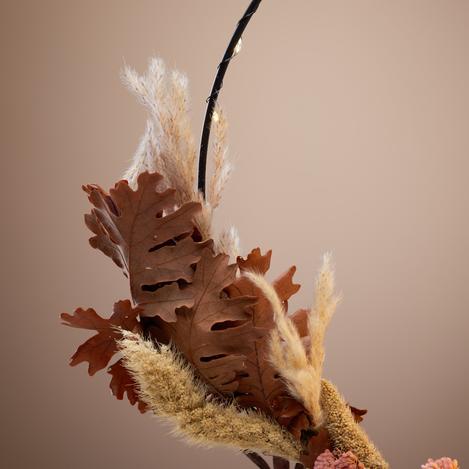 First tie the Micro LED chain of light around the metal ring. The battery compartment should be fixed with wire in a place that will later be covered with dried flowers.