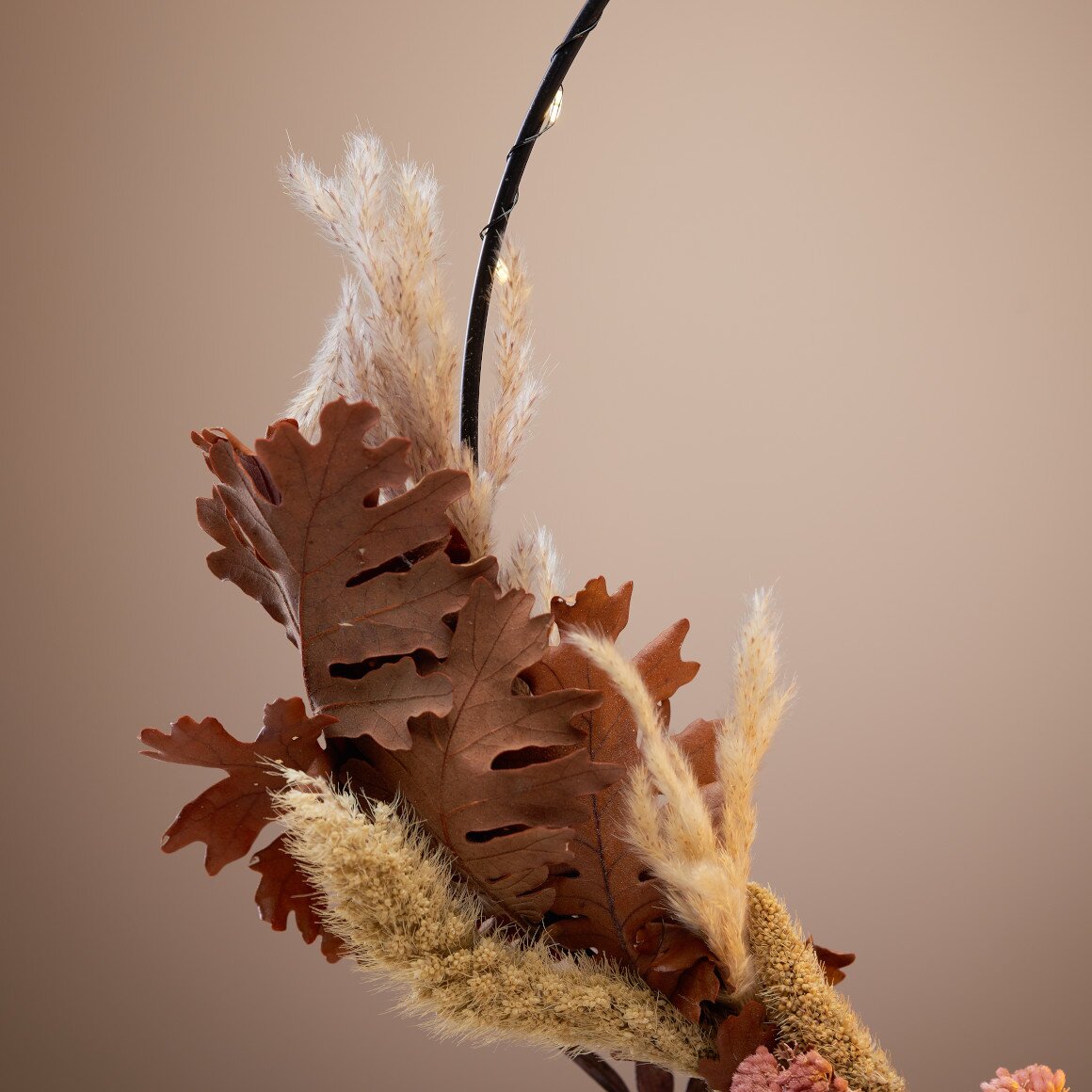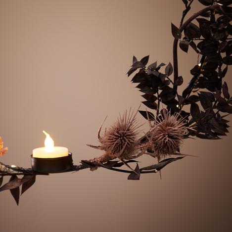 Now arrange dried flowers on both sides of the tealight spout in the lower half by tying them to the metal ring with binding wire. Use natural flowers according to your personal taste.