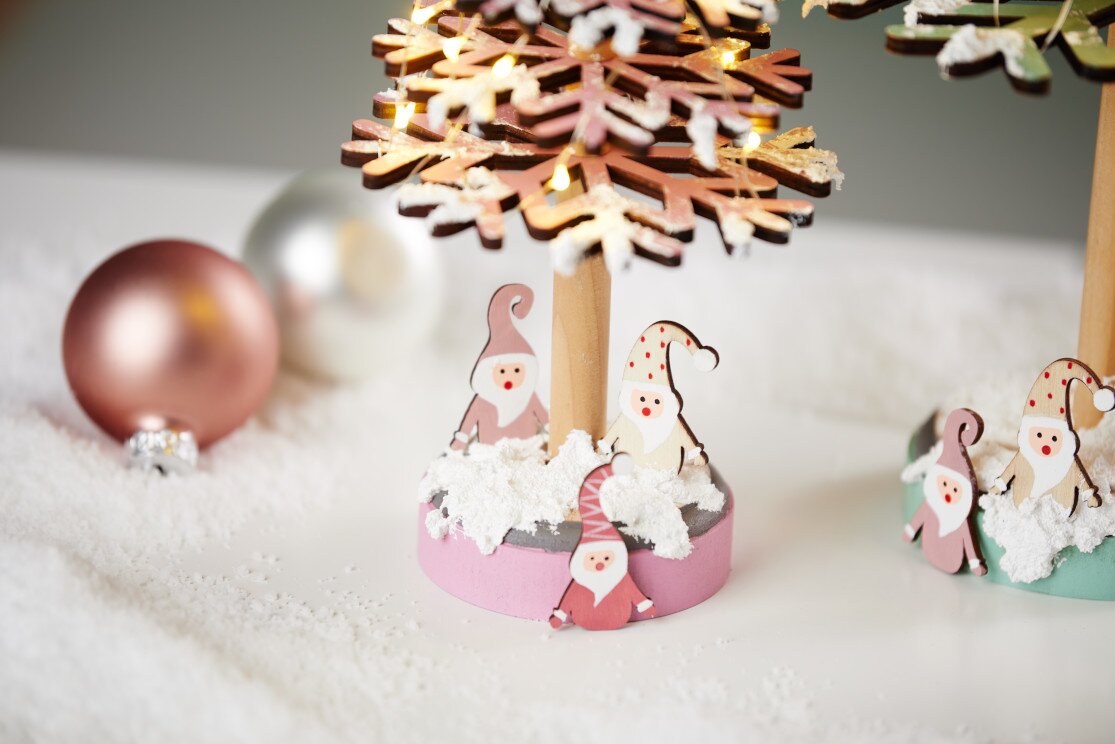The pretty wooden fir trees of the VBS craft set "Tannenbaum" are simply painted, put together and decorated. Let our decoration example inspire you for your own crafting fun!