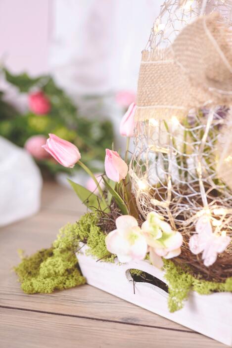 The tray will now be decorated with Willow . The wire egg is placed in this "Easter nest". Moss, tulips, hydrangea flowers and pearl hyacinths complete the Floristry. The individual decorative parts of the arrangement should be fixed with hot glue
