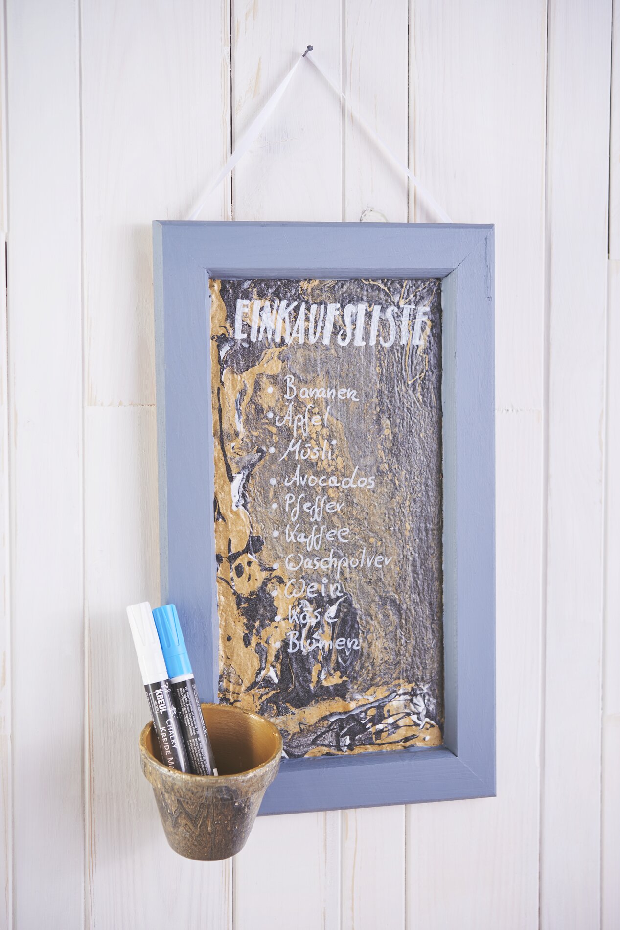 Finally, drill two holes in the top of the plywood board and draw a Cotton cord through it. Leave a longer piece on one side Cord to which you can attach Chalk marker one.