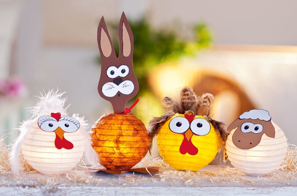With only little effort you can quickly create funny animal figures from lanterns and Straw silk paper . This handicraft instruction contains a template with the help of which the heads of rabbits, chickens and sheep can be made. The funny chicken, sheep and Easter bunny motifs belong in every Easter decoration and are also a welcome gift idea