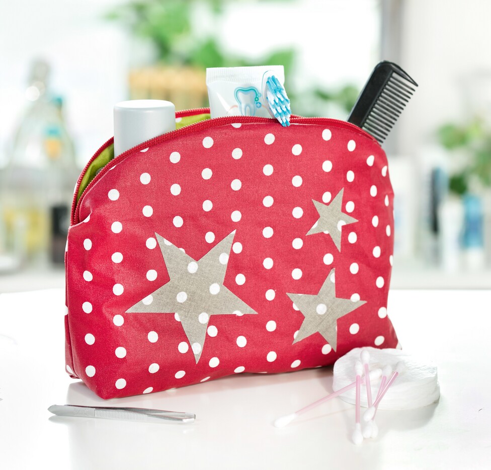 Next, topstitch the turning opening with the straight stitch and then put the inside into the outside pocket. Finally, glue the stars with the fabric adhesive - and your new cosmetic bag is ready!