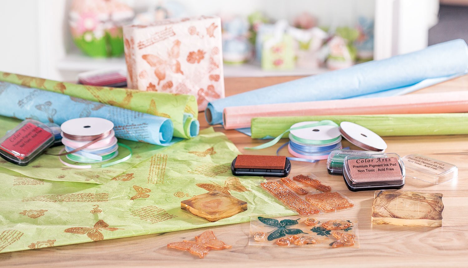 Acrylic blocks and stamps are used to make stamps with which the Straw silk paper is designed. Afterwards, the Straw silk paper can also be stuck on gift boxes or packages and give them a unique look.