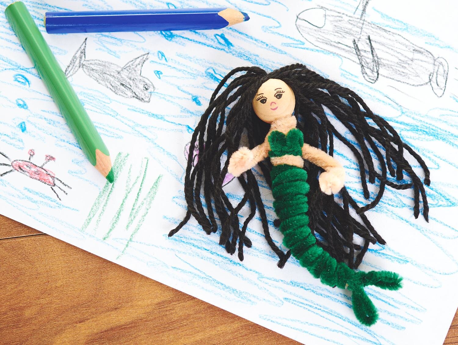 Mermaid: Sweet mermaid requires three skin-colored pipe cleaners. Cut 10 cm of one of the chenille wires and prepare it for the arms. Twist all 3 wires together and wrap around one. For bikini top and tail fin, separate 12 cm each from a green Chenille wire . Connect the remaining piece with two more green pipe cleaners. Glue one green wire end to the upper body, wrap the remaining Chenille wire tapering to a point around the skin-coloured Chenille wire . Bend two fins from the tail fin wire and glue them to the tip, form two small loops for the bikini top and bend them to the body, fix them with glue. For the head, glue a Wooden ball with face on the torso and finally glue the mermaid's hair with scraps of wool.