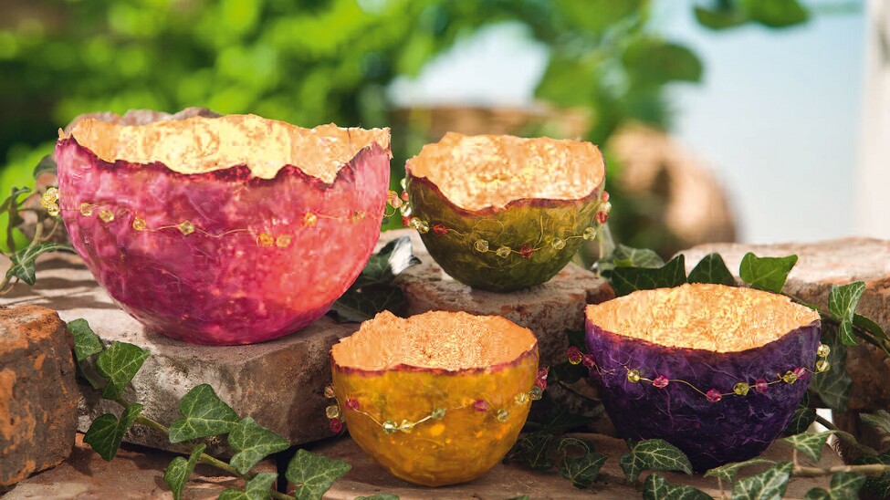 Simply inflate the balloon with Straw silk paper stick it on, let it dry and cut open the balloon. With the help of Gold leaf priming milk and Leaf metal gild the resulting "bowl" from the inside and colour it from the outside.