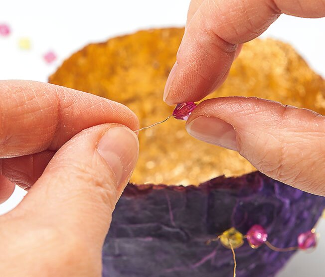After drying, make holes in the piercing Wind light and golden wire and thread it Acrylic beads through.