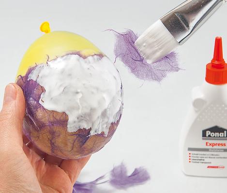 Tear them Straw silk paper into pieces and use wood glue to glue several layers thick up to half of the balloon. Always let the individual layers dry thoroughly.