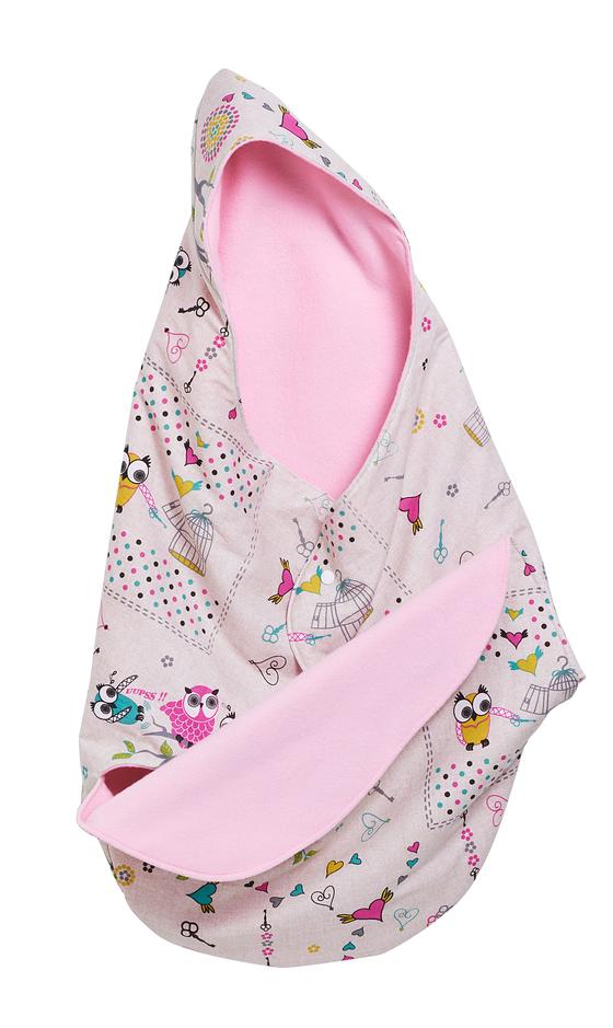 In the next step, the different pieces of fabric are joined together to fit together perfectly: First, the back part is spread out with the right (printed side up). With Cotton fabric down, the hood and front part are then placed on the back-Fabric cut , with the fleece fabric as the top layer on top, right side down. The pieces of fabric are stapled or tucked together well, and except for a turning opening on one side, the fabric is sewn all the way around. Turn the sewing over and close the turn opening (sew the fabric together). A baby wrap blanket has been created.