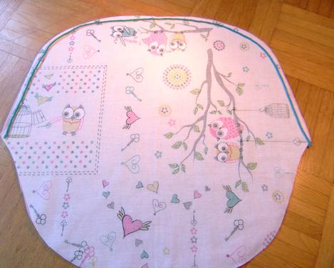 Belt slot for the baby car seat On Pattern there is a marking for the belt slot. This is transferred to the back of the finished blanket and is made like a buttonhole: sewed around with a zigzag stitch and finally carefully cut in.