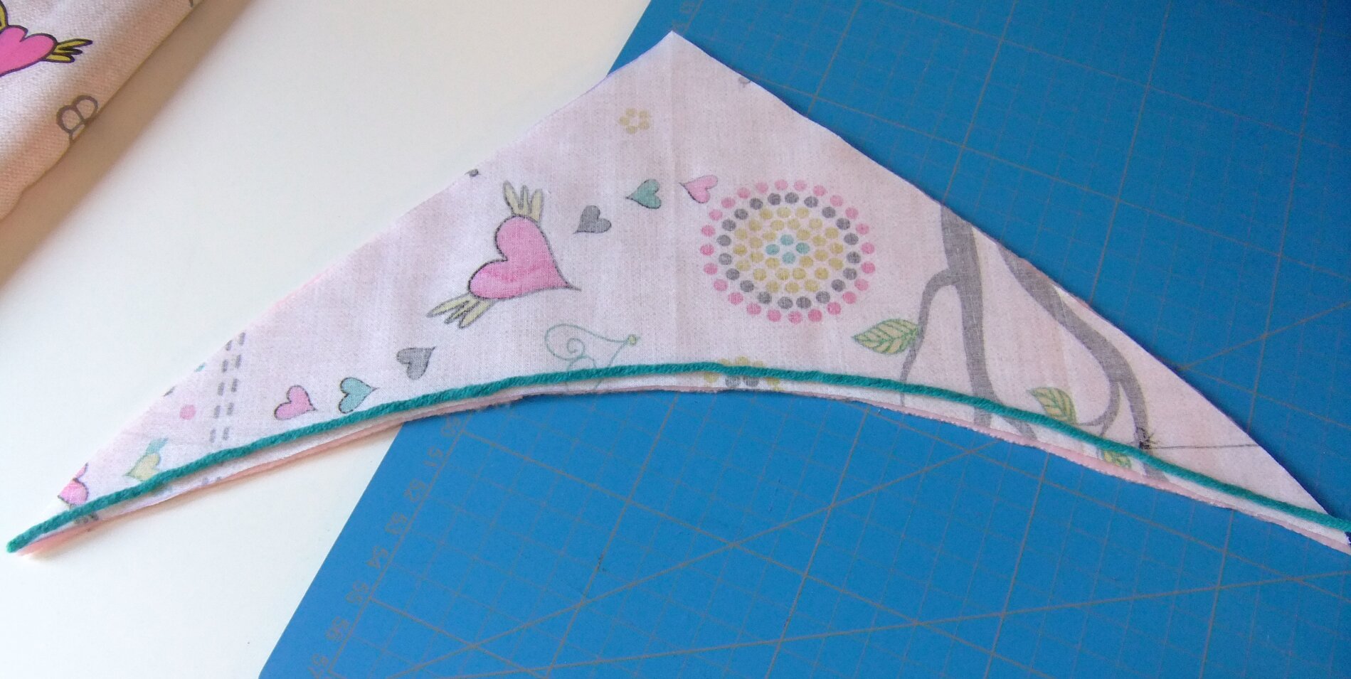 The two Fabric cuts for the front part are now placed right on top of each other (printed side and "good" fleece side), fixed with Pins or with Clover Wonder Clips and sewn together at the top edge (see photo: blue line). The resulting front part is turned over and the seam is stitched again from the right side. Now the Fabric cuts of the hood are also placed on the right side, fixed, sewn together and then turned over.