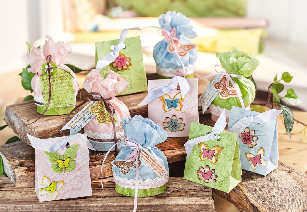 How do I decorate the gift boxes with the tags? Stick small pieces Straw silk paper on photo cardboard with Napkin varnish . Then apply the butterfly motifs with the stamp and then cut them out. Finally, you can punch holes in the pendants and attach them to the boxes with Satin ribbon together with the scattered flowers.