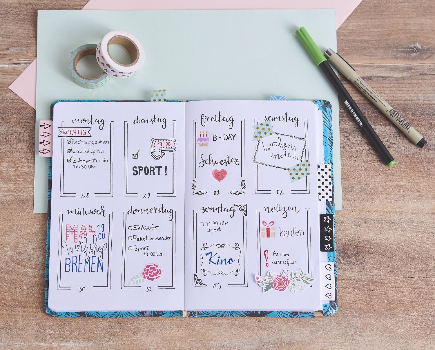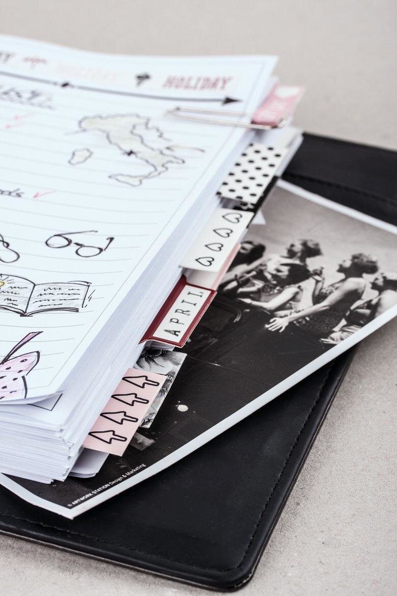 In our example, after inserting the overview sheets, we attached the glue registers and then embellished the planner with the help of the templates and Washi Tape.