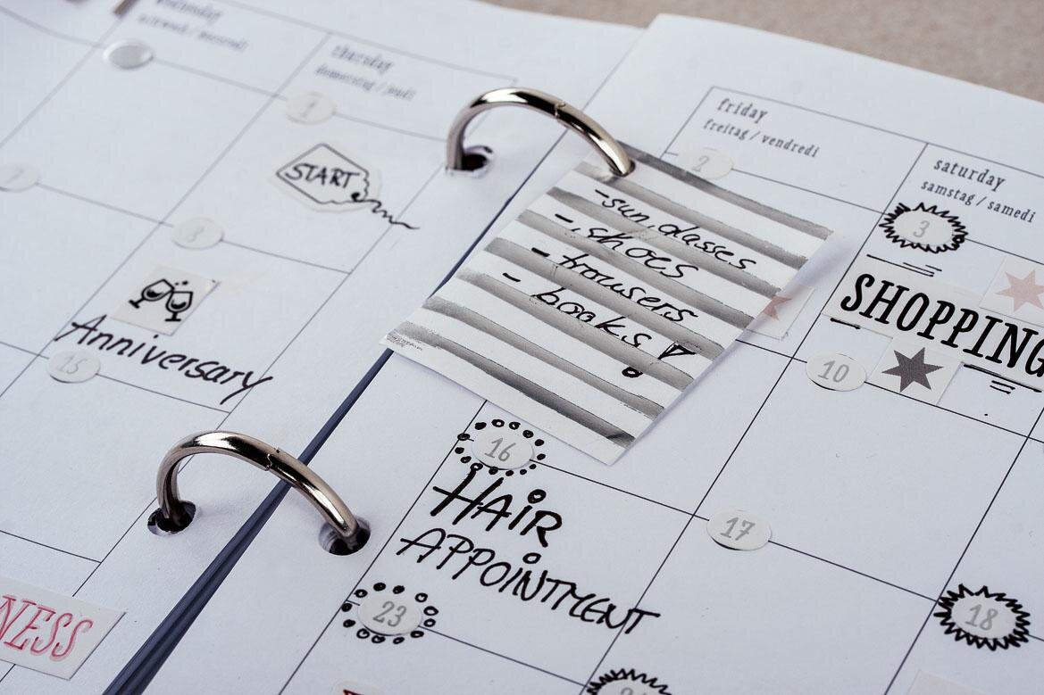 The first thing you should do is fill your planner with the sheets that are important to you. Available are yearly overviews, monthly and weekly overviews, registers, notepads and adhesive registers.