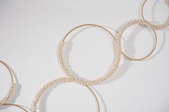 Arrange the metal rings as you like to create a decorative pattern. First, cut a strand of macramé yarn about 4 meters long. (If this length is not enough for your knotting, you can always continue later with another piece of macramé yarn).
