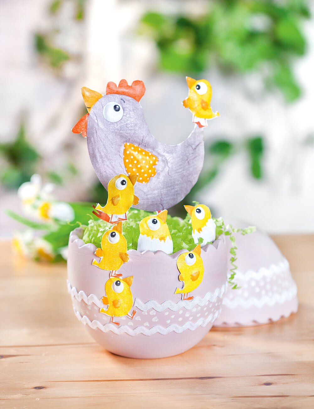How can I make the ceramic egg easily, quickly and well?First, prime the ceramic egg with Handicraft paint in beige. Then glue the Napkin with Napkin varnish on an aluminium sheet. As soon as the Napkin is dry, cut out the individual napkin motifs and carefully model them on the soft mat using the press tool. Depending on your taste, details such as wings, eyes or cockscomb can be embossed with the embossing pen with fine contours or worked out over a large area. Now the ceramic egg is decorated with the help of double-sided Adhesive tape and serrated strands. You can also use white Handicraft paint to dot dots between the individual serrated lines.