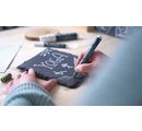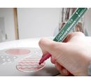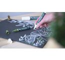 The water-based chalk has a matt, opaque and lightfast application. It is particularly suitable for window panes, but also adheres to tiles, boards and metal. Before application, it is recommended to remove any residues such as dust and grease from the surface. A simple glass cleaner is sufficient for this. You can always wipe your motifs with a damp cloth and draw again