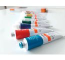 • 12 x 12 ml tubes in the colours titanium white, Lemon Yellow, Vermillion, Carmine Red, Coelin Blue, price-blue, brilliant violet Chrome Oxide Green, Light green, Ochre Yellow, Sienna fired and Black