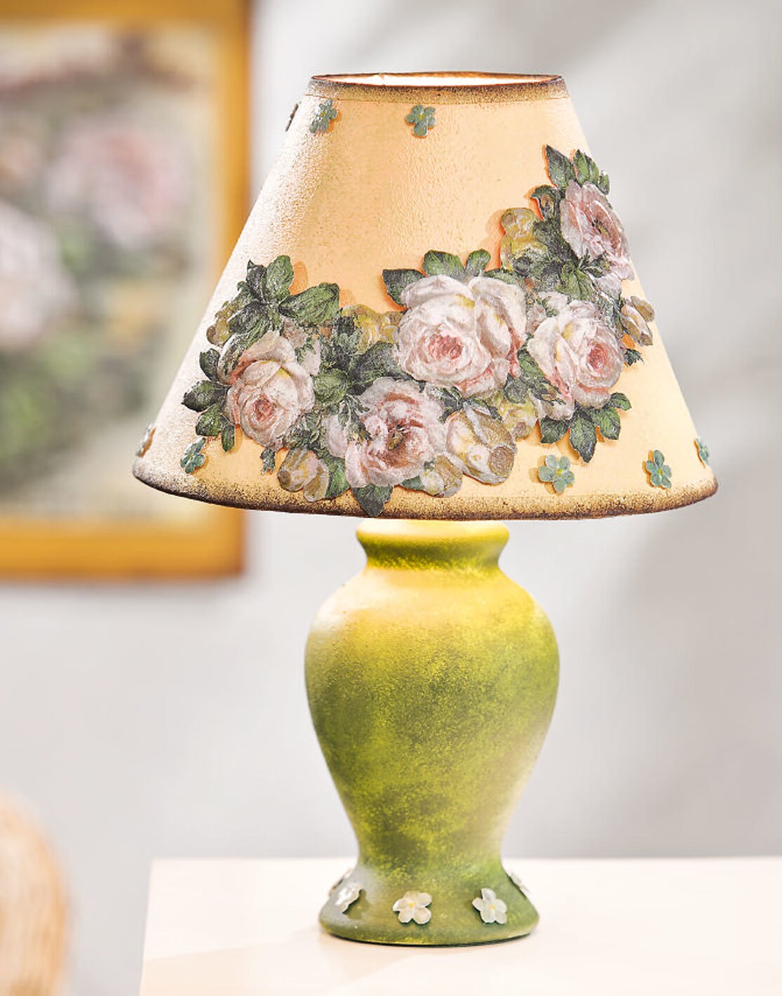 Glue the rose arch and the small flowers with Napkin varnish on white primed aluminium sheet and cut out the motifs after drying. Now draw the contours on the special mat first from the front side with the small ball of the metal pressing tool, then emboss the motifs with the large ball from the back. If you like the effect, glue the individual parts with 3D-Glue pads to Lampshade and foot.