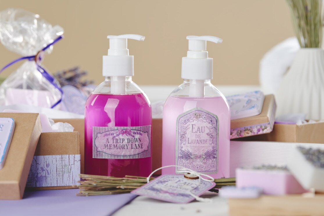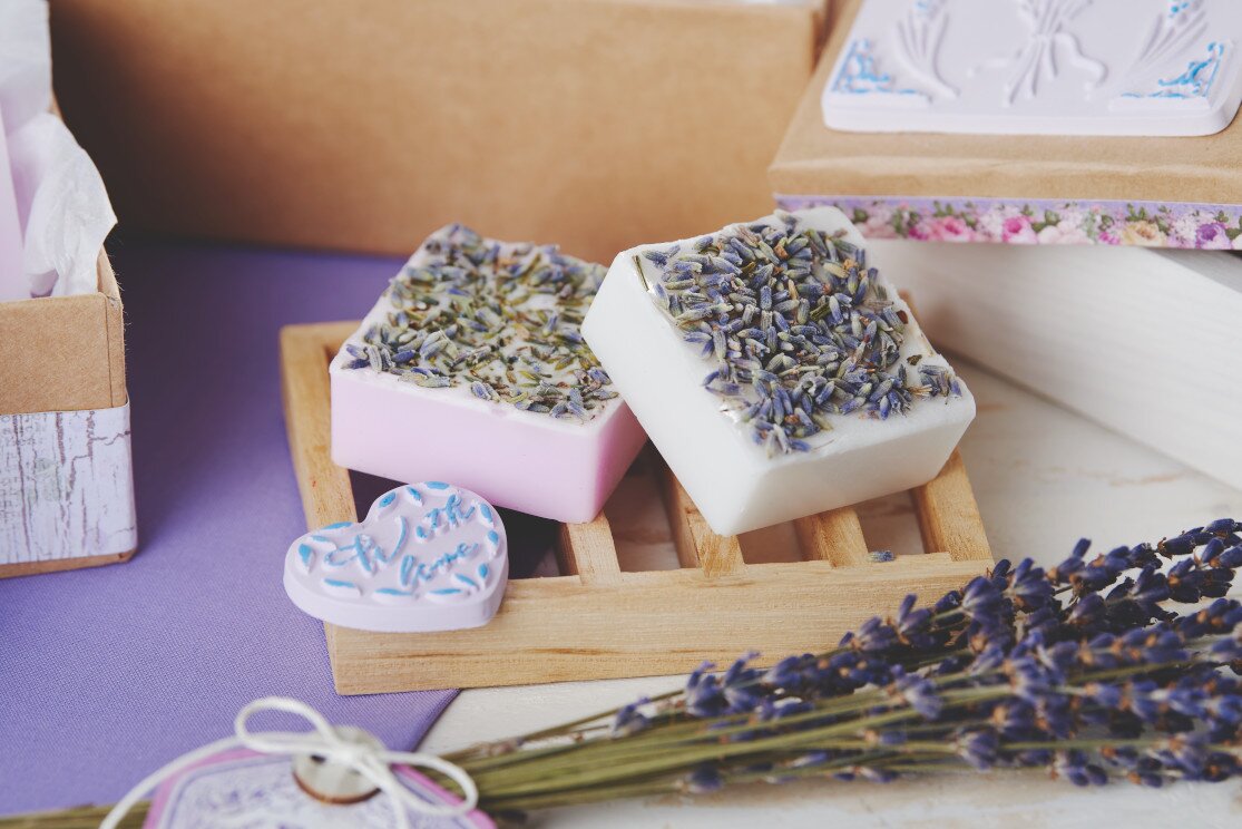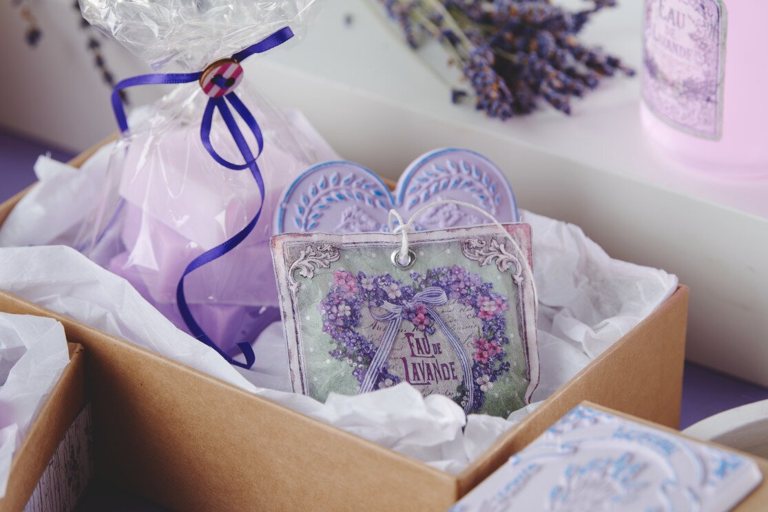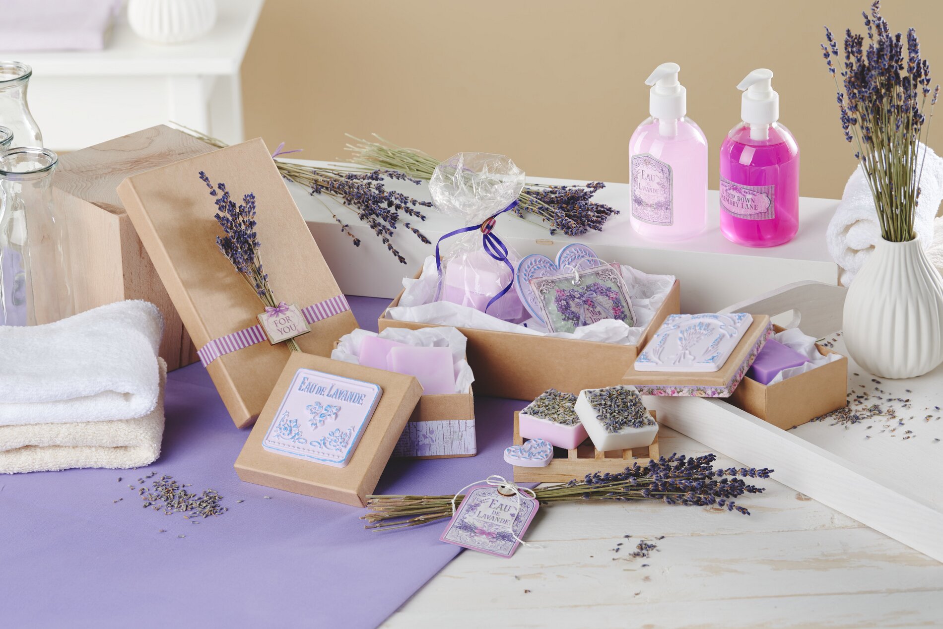 With the help of straw silk, laser cut motifs and , lavender bouquets, it is fun to create lovingly decorated gift boxes for the soaps from plain cardboard boxes.