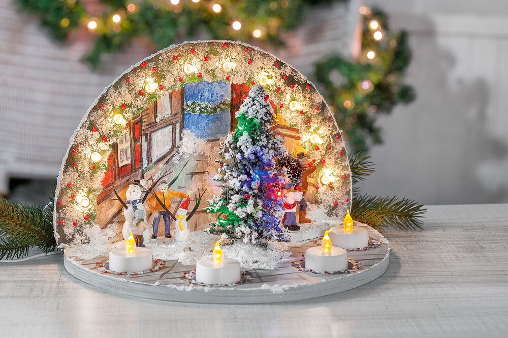 After drying, the fir tree is glued to the middle of the base plate with hot glue. Then it can be screwed Light arch together. It should be made sure that the cable of the fir tree is Light arch hidden behind it. Now glue on the other figures, putty Structure Paste around them and set some accents with it Bristle brushes