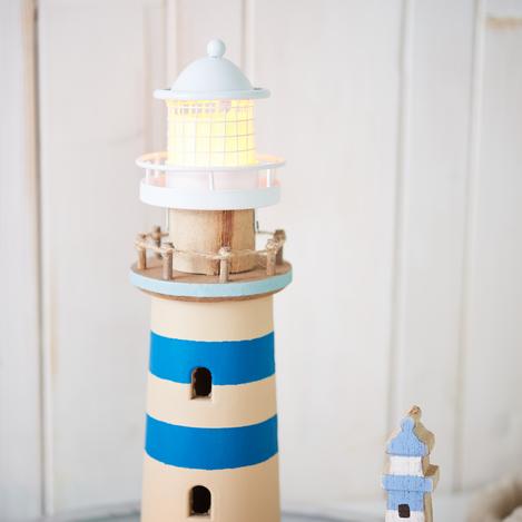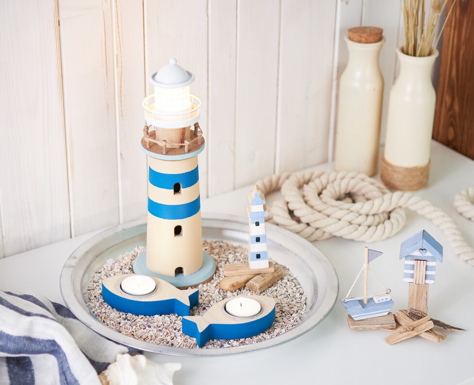 Paint the lighthouse and the tealight holders in maritime colors according to your personal taste. For our idea, we used the colors blue-green, beige and sea green.