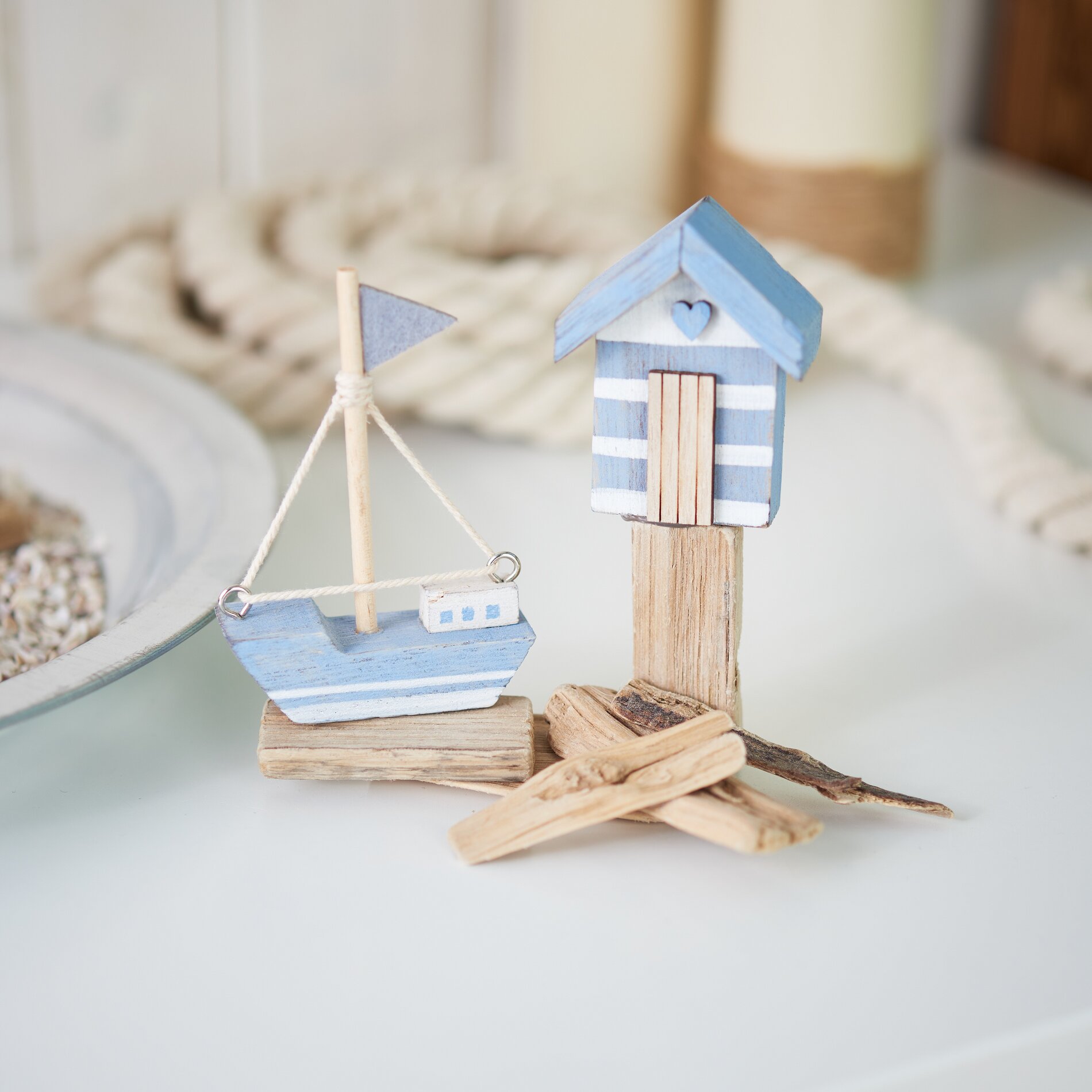 Use hot glue to stick small maritime wooden decorations to driftwood. The driftwood provides a great contrast to the colored elements.