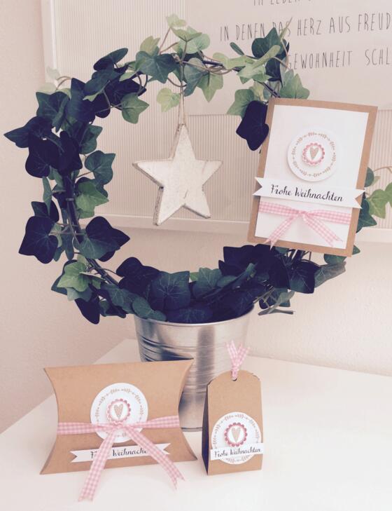 Cut out a card and a give-away from Kraft paper Punch the ends of the give-away. The packaging is original at VBS available. All motifs are stamped and punched and later fixed with self-adhesive spacers. Decorate with ribbon and print, stamp or write a sign " Merry Christmas" by hand. Ready ❤