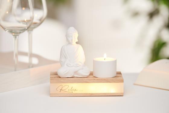 Pouring blocks and craft blocks - a very special combination! The casting of the Buddah figure and the candle holder is easy to do and we shorten the waiting time with this idea by making a stylish light box with a few wooden blocks and an acrylic block and thus skillfully setting the self-cast decorative objects in scene.