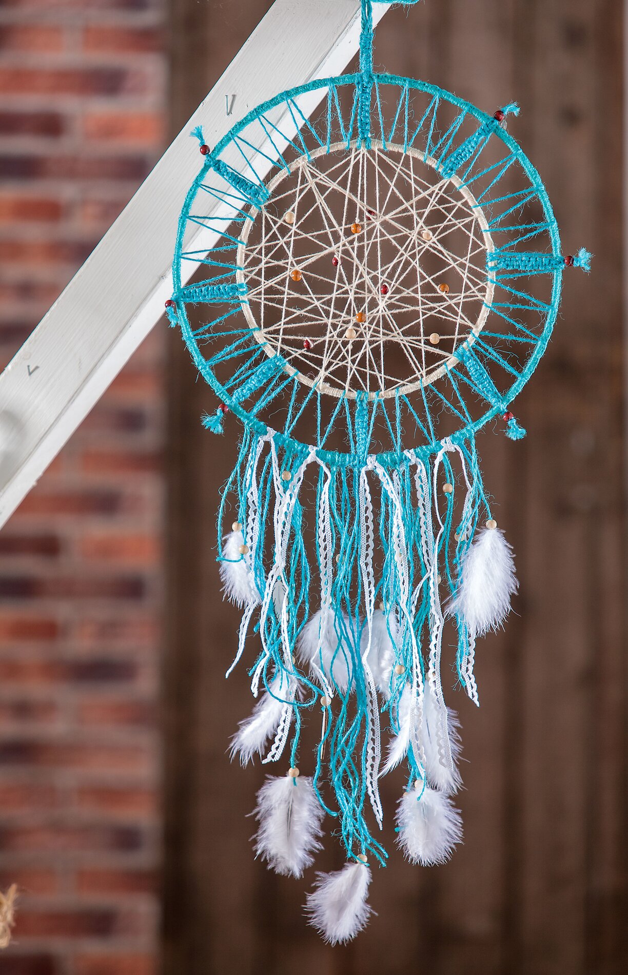 Decoration and FeathersThere is hardly a dream catcher without wooden beads and Feathers. Hang the dream catcher on a hook and tie jute ribbons or matching ribbon in the lower quarter with Feathers and beads.