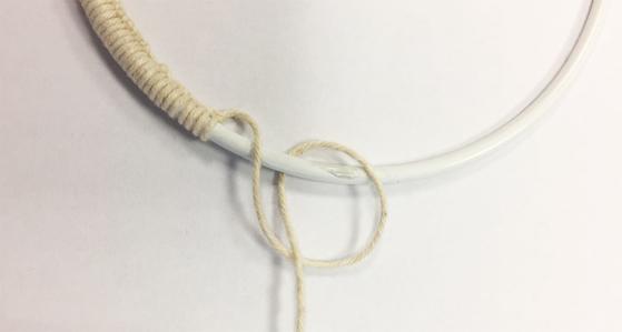 For the green dream catcher you need one metal ring each in Ø 10 cm and in Ø 15 cm. The small ring is wrapped with white Warp yarn, the big one with green Jute yarn . Here the thread is laid to a loop and always knotted at the same place, so that a clean winding optics develops.