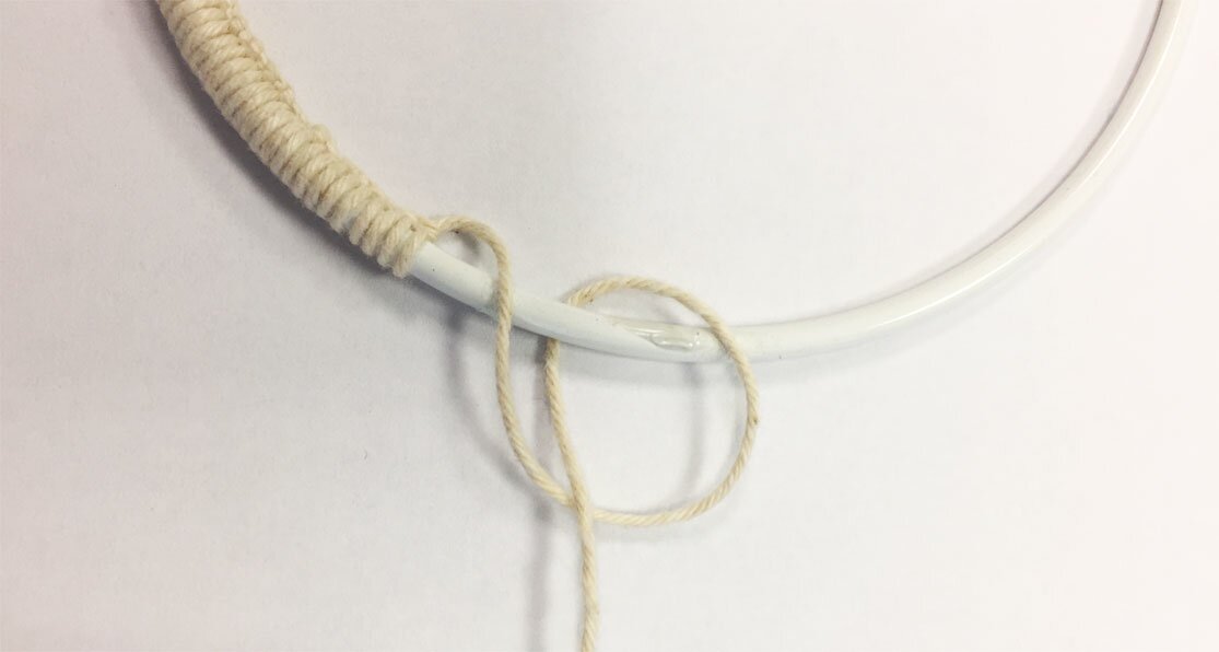 Now the natural coloured Warp yarn is wrapped around the small metal hoop with wide loops. As soon as a complete round has been wound, the thread is wound in the same way in the 2nd round into the loops of the first round.