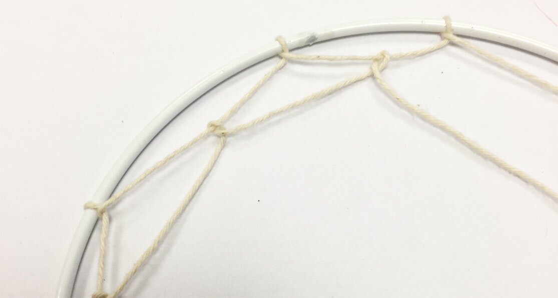 Macramé-stringsTie Macramé-strands knotted in the weaver's knot between the rings, the hanging band can also be decorated in this way