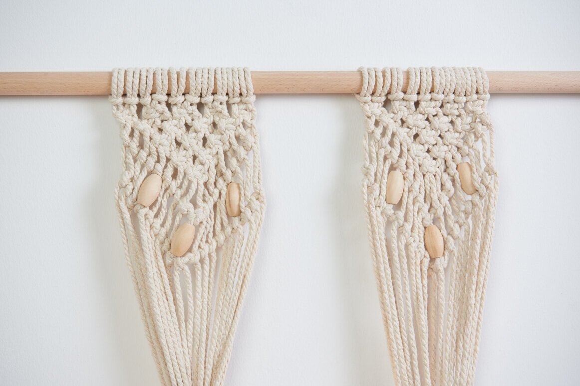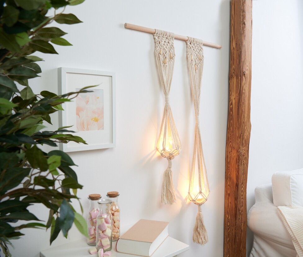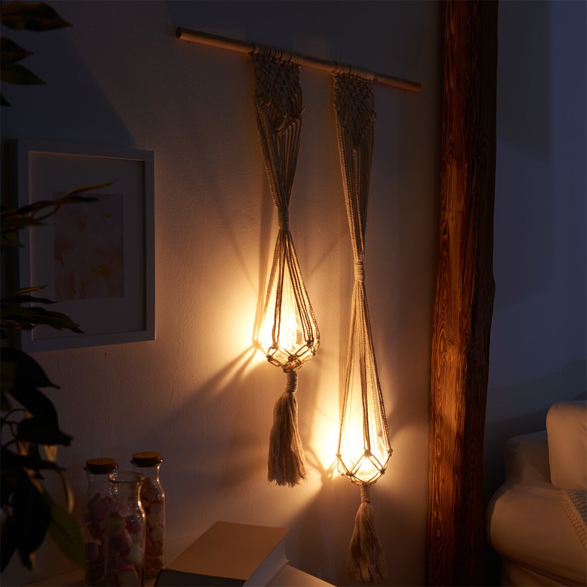 After some time, start tying 2 - 3 rows of staggered square knots: Tie them so that they form a trough for a tea light jar, finally tie all the strands together with a winding knot (this is also the fixation for the tea light jar).