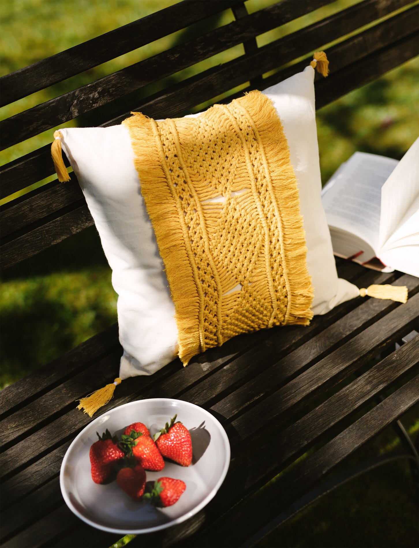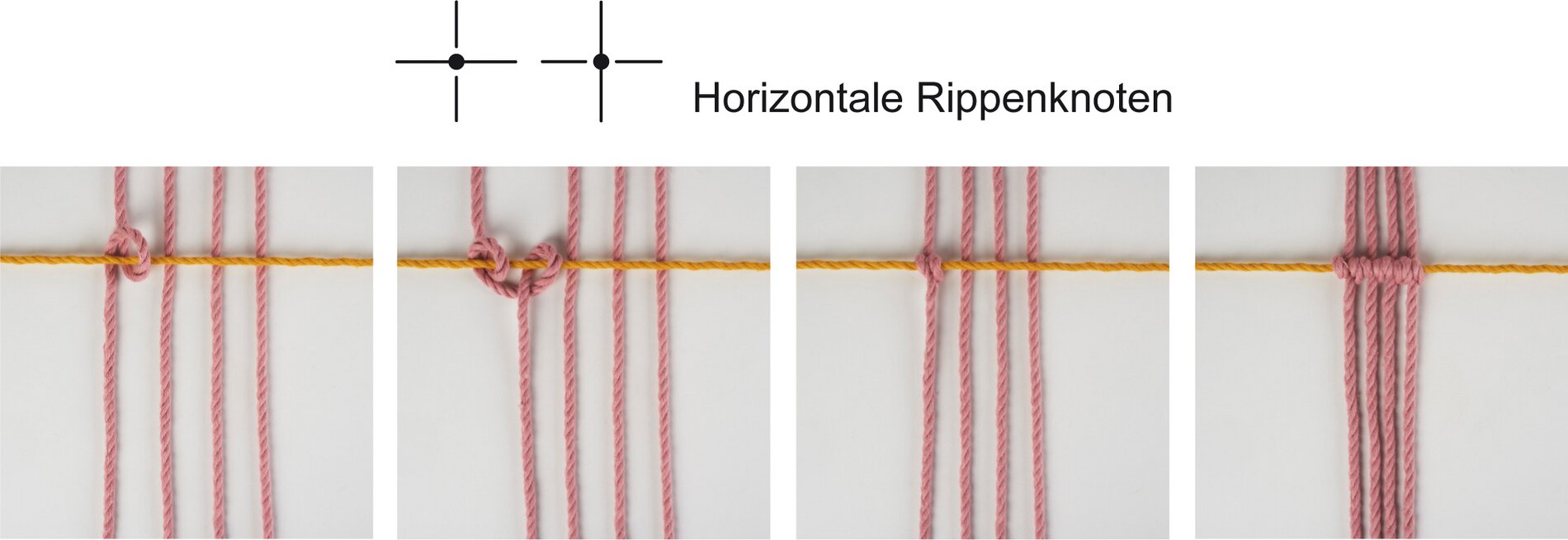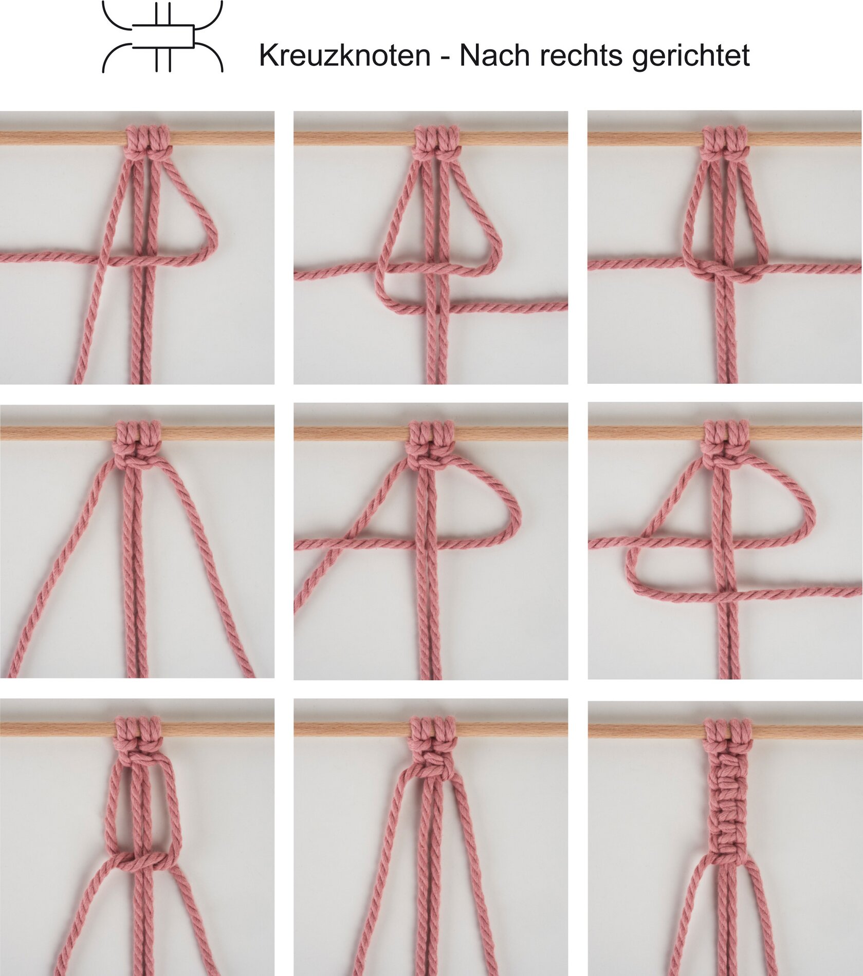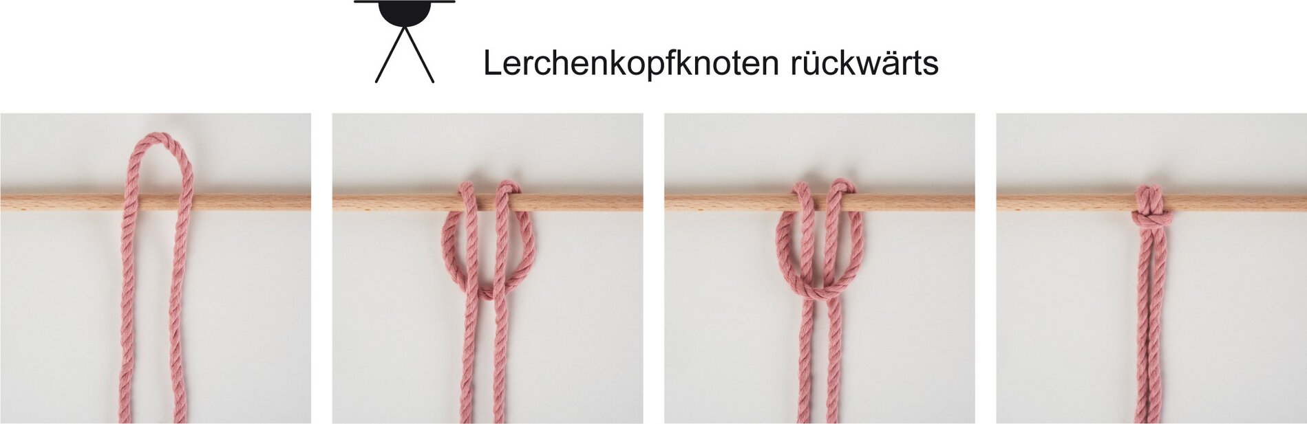 Cut 44 skeins of yarn, 150 cm each. Lay these strands double and knot them all backwards on a round peg using the lark's head knot. Fix this to a table or shelf with extra strong tape so that the stick is anchored stably and you can tie comfortably.